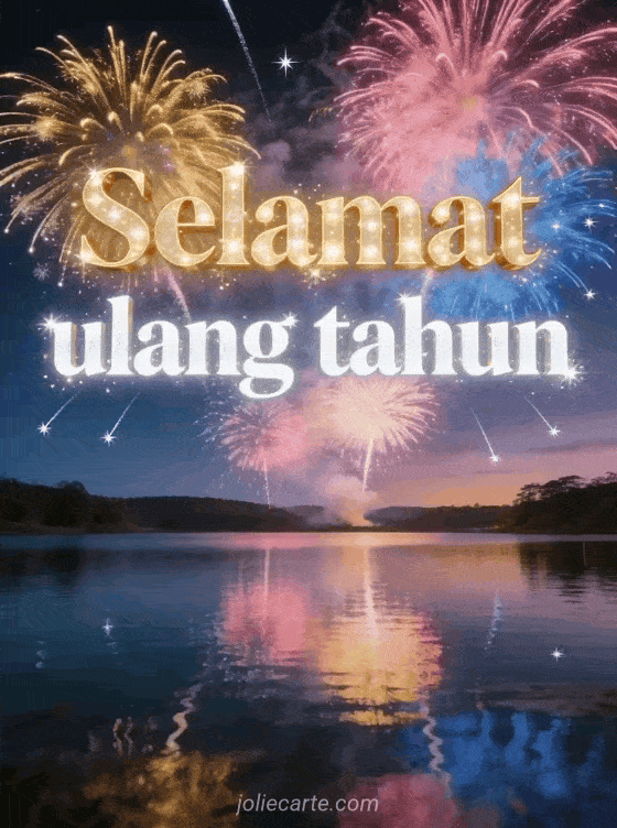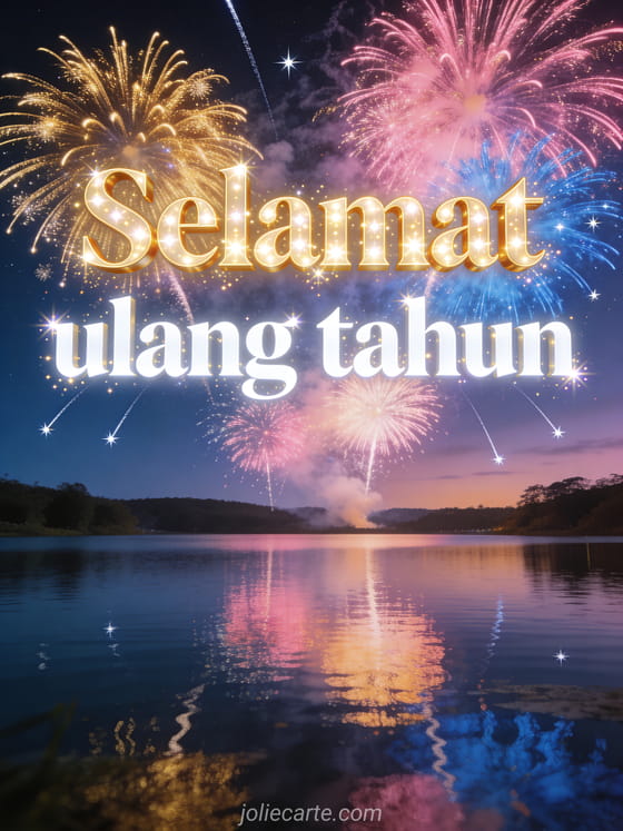 Rayakan ulang tahun dengan kartu menakjubkan ini yang menampilkan huruf emas berkilau, kembang api warna-warni yang meledak di atas danau tenang di bawah langit berbintang. Temukan juga kartu ulang tahun dengan huruf emas atau kartu ulang tahun dengan berang-berang.