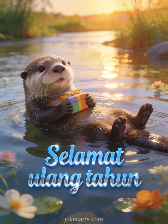 Cerahkan ulang tahun seseorang dengan kartu menawan ini yang menampilkan berang-berang lucu mengapung di sungai yang tenang, memegang hadiah warna-warni dalam cahaya emas senja. Temukan juga kartu ulang tahun dengan huruf emas dan kembang api atau kartu ulang tahun dengan kucing dan champagne.