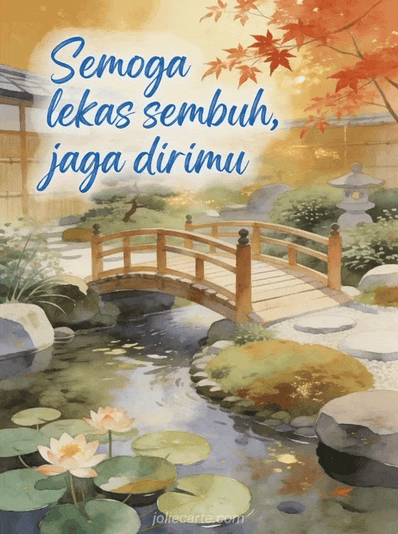Kirim kartu kesembuhan yang indah ini dengan taman Jepang zen dengan jembatan kayu dan teratai bermekaran untuk mendoakan kesembuhan. Temukan juga kartu kesembuhan sayangku atau kartu cinta dan kesembuhan atau kartu semoga lekas sembuh.