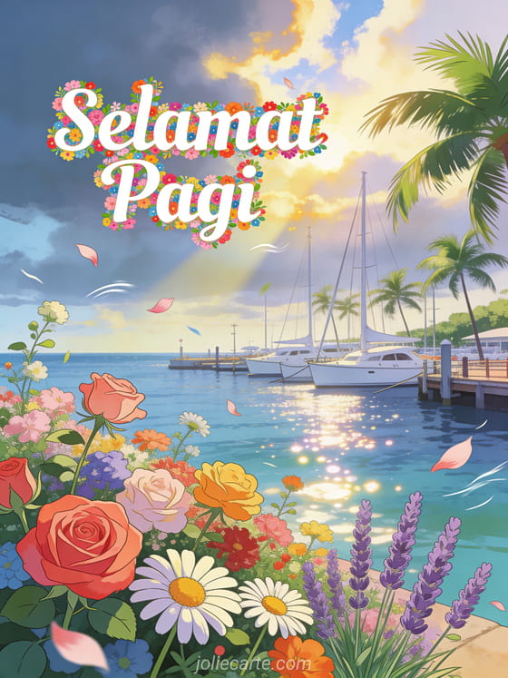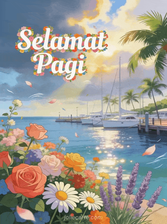 Kirimkan ucapan Selamat Pagi yang ceria dengan marina cerah yang indah, kapal layar putih dan bunga-bunga warna-warni. Temukan juga kartu Selamat Pagi atau kartu animasi selamat pagi lucu.