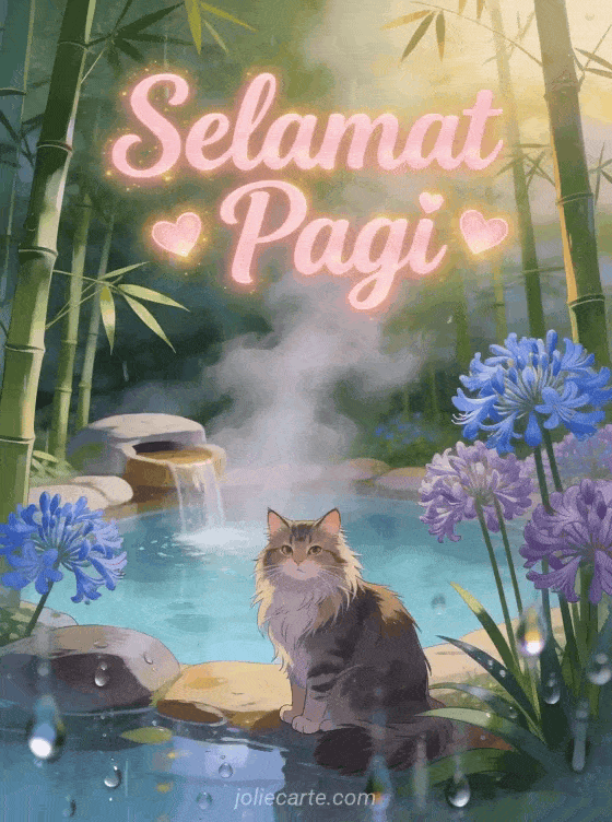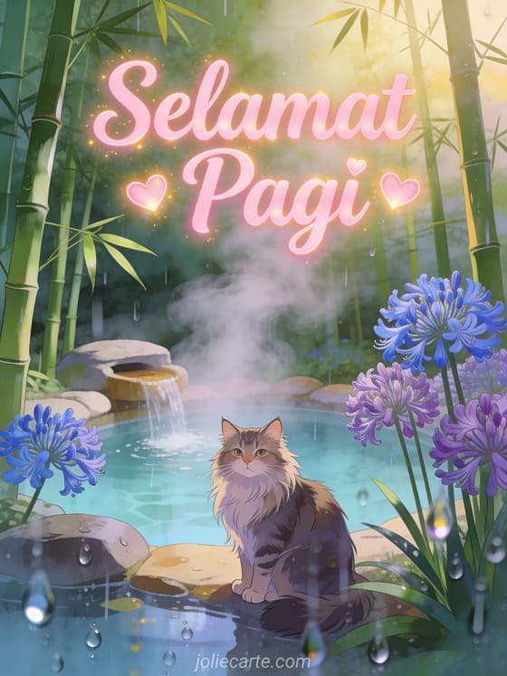 Kirimkan ucapan Selamat Pagi yang lembut dengan kucing Maine Coon yang megah di samping sumber air panas yang dikelilingi agapanthus. Temukan juga kartu Selamat Pagi bunga atau kartu Selamat Pagi.