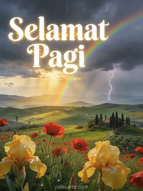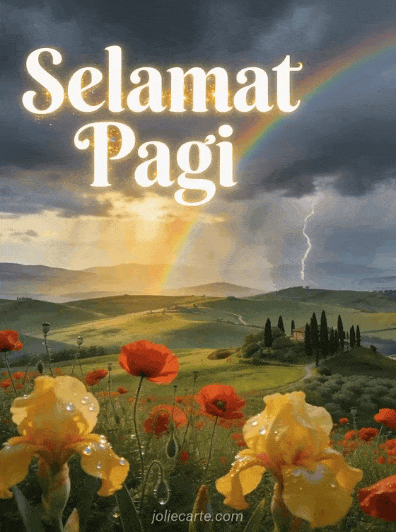 Kirimkan ucapan Selamat Pagi yang hangat dengan pemandangan indah Toscana berbukit hijau, poppy merah dan pelangi. Temukan juga kartu animasi selamat pagi lucu atau gif selamat pagi.