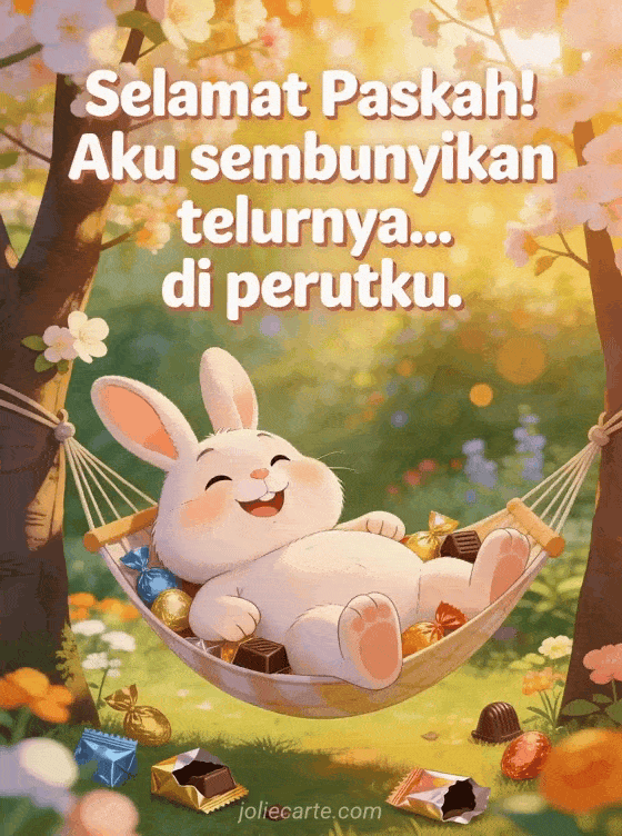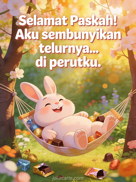 Bagikan tawa di hari Paskah dengan kartu kocak ini tentang kelinci yang memakan semua telur. Temukan juga humor Paskah dengan cokelat, kartu Paskah lucu dengan humor atau kartu lucu selamat Paskah.