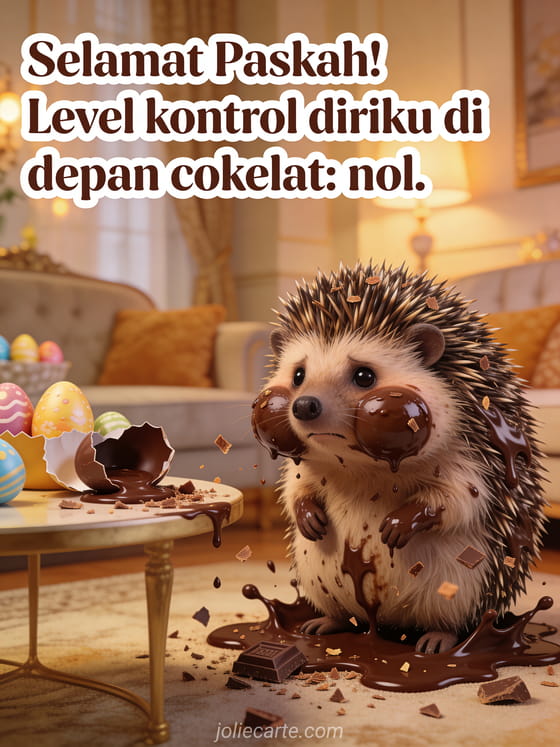 Bagikan ucapan Paskah lucu ini dengan landak yang merasa bersalah dengan pipi penuh cokelat dikelilingi telur Paskah yang sudah dibuka di ruang tamu yang nyaman. Temukan juga kartu lucu Paskah atau kartu lucu akhir pekan Paskah.