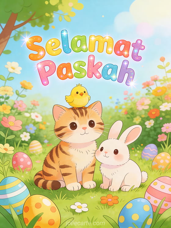 Bagikan ucapan Paskah gembira ini dengan hewan-hewan menggemaskan di taman Paskah: anak ayam di atas kepala anak kucing belang, kelinci kecil di sampingnya, dikelilingi telur hias di rumput berbunga. Temukan juga kartu video kelinci Paskah atau kartu gif kelinci Paskah.