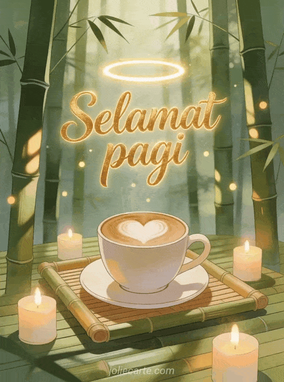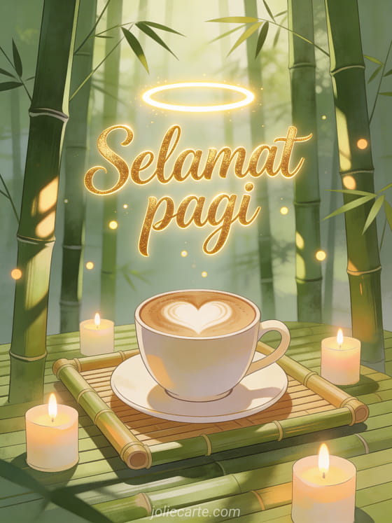 Kirim selamat pagi yang damai dengan kartu zen kopi ini. Secangkir kopi latte art berbentuk hati di atas nampan bambu di hutan bambu, dengan lilin menyala di sekelilingnya, cahaya yang menerobos batang bambu hijau tinggi dan titik-titik cahaya melayang di udara. Temukan juga kartu kopi pagi dengan perahu berbunga, kartu kopi pagi tepi laut atau kartu kopi pagi dengan kecup.