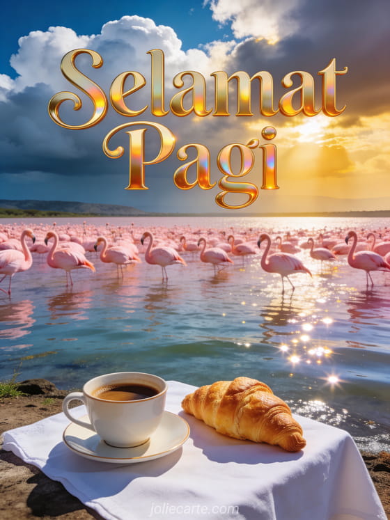 Kirimkan ucapan Selamat Pagi yang indah dengan kopi dan croissant di tepi danau yang dipenuhi flamingo. Temukan juga kartu kopi selamat pagi atau kartu hati selamat pagi kopi.