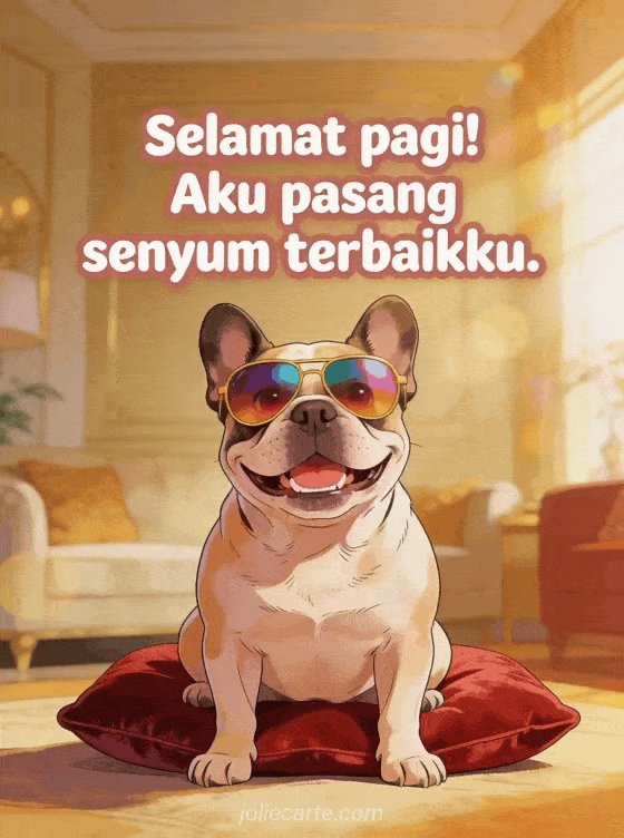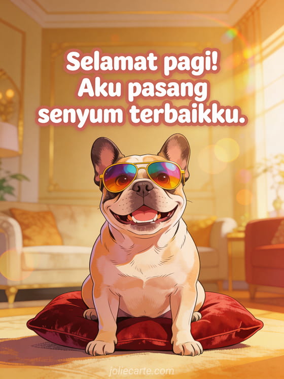 Cerahkan pagi seseorang dengan kartu selamat pagi yang lucu ini. Seekor French bulldog duduk dengan bangga di atas bantal beludru merah dengan kacamata hitam warna-warni besar dan senyum berlebihan. Temukan juga kartu lucu pagi autopilot, kartu kopi pagi penuh humor atau kartu selamat pagi yang lucu.