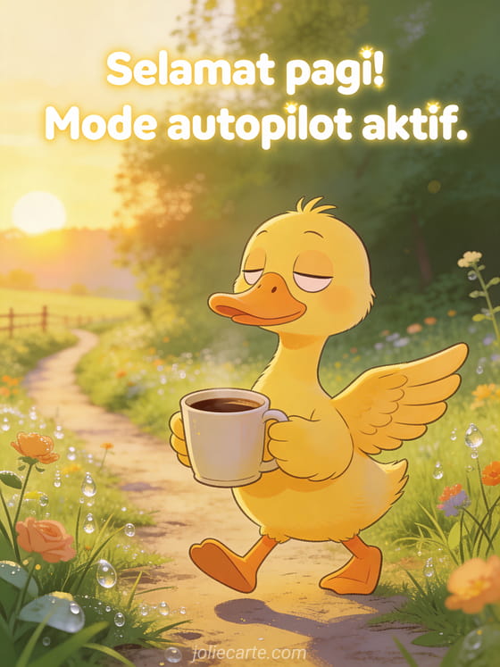 Mulai hari dengan senyuman dengan mengirimkan kartu selamat pagi yang lucu ini. Seekor bebek kuning berjalan setengah tertidur sambil memegang cangkir kopi besar, menangkap sempurna mode autopilot di pagi hari. Temukan juga kartu lucu kopi pagi atau kartu selamat pagi penuh humor.