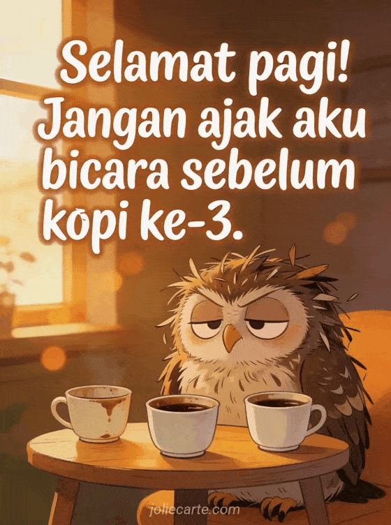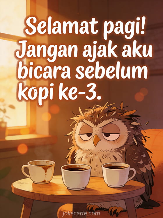Mulai hari dengan tawa dengan mengirimkan kartu selamat pagi penuh humor ini. Seekor burung hantu acak-acakan dan cemberut duduk di depan tiga cangkir kopi kosong, menangkap sempurna suasana hati sebelum kopi. Temukan juga kartu selamat pagi yang lucu.