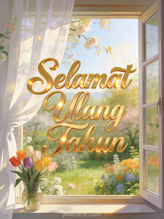 Ucapkan selamat ulang tahun dengan kartu menenangkan ini yang menampilkan vas tulip di ambang jendela dengan tirai putih dan pemandangan musim semi dalam cahaya emas. Temukan juga kartu ulang tahun elegan dengan sampanye atau kartu ulang tahun dengan kupu-kupu.