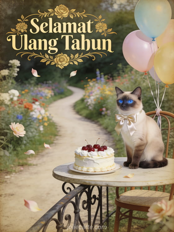 Ucapkan selamat ulang tahun dengan kartu vintage elegan ini yang menampilkan kucing siam di samping kue dengan ceri di jalan pedesaan. Temukan juga kartu ulang tahun lucu untuknya atau kartu selamat ulang tahun cantik untuknya.