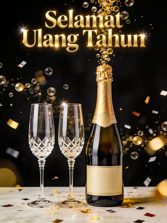 Rayakan ulang tahun dengan gaya menggunakan kartu mewah ini yang menampilkan botol sampanye elegan dengan dua gelas kristal, gelembung emas naik, latar belakang hitam dengan kilatan cahaya emas dan konfeti. Temukan juga kartu ulang tahun dengan saksofon atau kartu ulang tahun untuk pria.