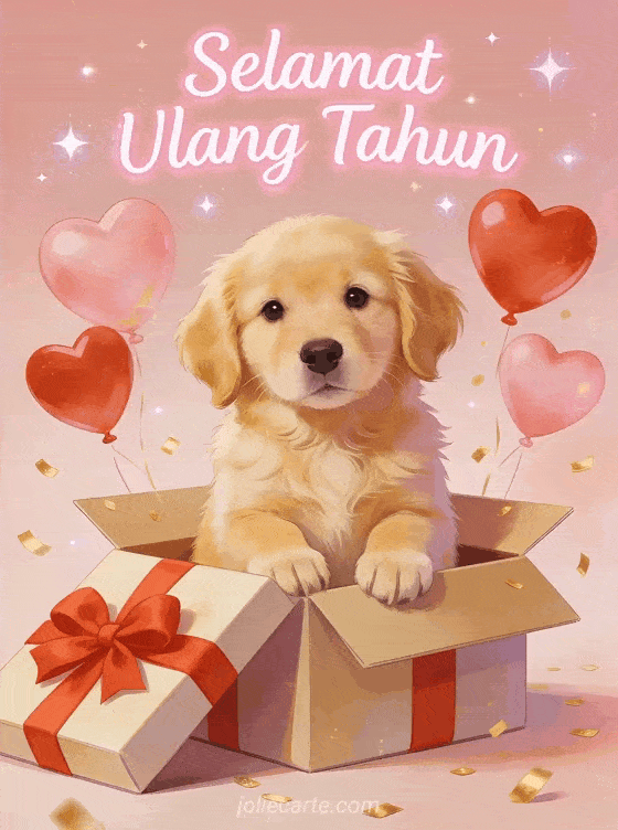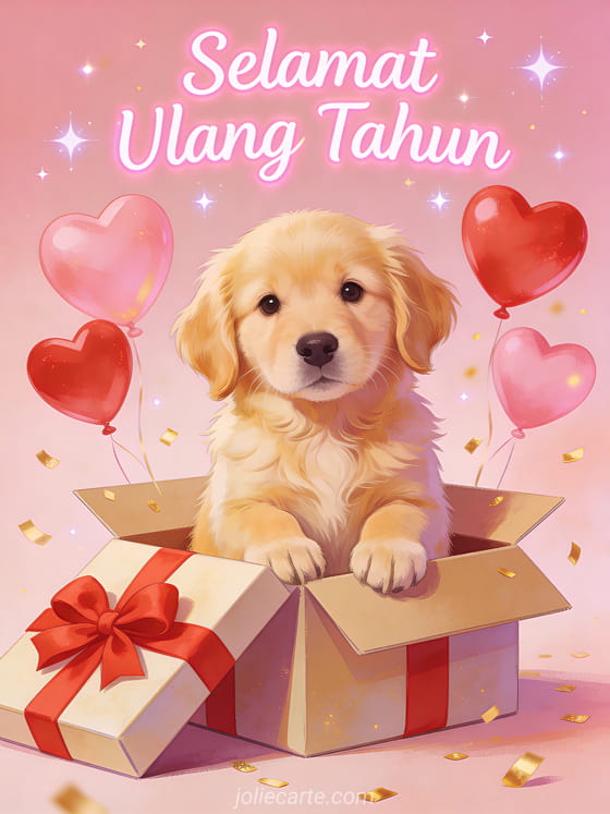 Rayakan ulang tahun dengan kartu menggemaskan ini yang menampilkan anak anjing golden retriever duduk di kotak hadiah terbuka dengan pita merah, dikelilingi balon hati merah dan merah muda, konfeti emas dan bintang berkelip. Temukan juga kartu ulang tahun romantis dengan lavender atau kartu ulang tahun cinta.