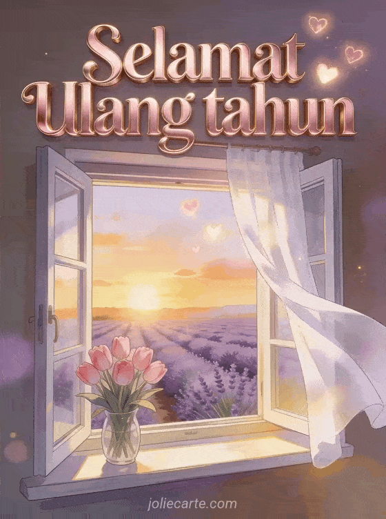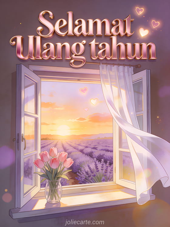 Rayakan ulang tahun romantis dengan kartu indah ini yang menampilkan jendela terbuka menghadap ladang lavender saat matahari terbenam, buket tulip merah muda di kusen jendela, tirai putih berkibar tertiup angin dan hati bercahaya di langit. Temukan juga kartu ulang tahun cinta atau kartu ulang tahun sayangku.