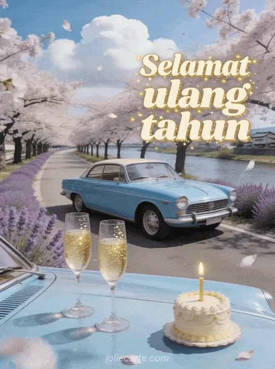 Rayakan ulang tahun dengan kartu retro menawan ini yang menampilkan mobil antik biru pastel parkir di bawah bunga sakura di tepi sungai di Jepang, dengan gelas sampanye dan kue ulang tahun. Temukan juga kartu ulang tahun dengan mercusuar atau kartu ulang tahun dengan kupu-kupu.
