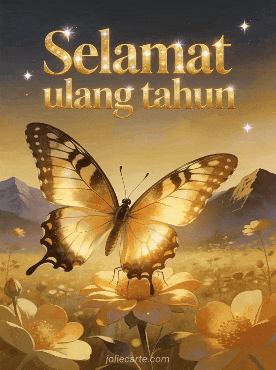 Rayakan ulang tahun istimewa dengan kartu menakjubkan ini yang menampilkan kupu-kupu swallowtail megah bertengger di bunga di taman emas saat senja, dengan pegunungan dan bintang berkelip. Temukan juga kartu ulang tahun romantis atau kartu ulang tahun lucu.