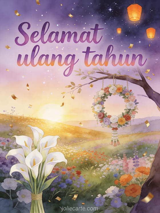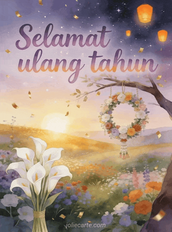 Rayakan ulang tahun dengan kartu bermimpi ini menampilkan lembah berbunga saat matahari terbit emas dengan calla lily yang elegan, mahkota bunga meriah, konfeti emas, dan lentera oranye melayang di langit berbintang. Temukan juga kartu animasi ulang tahun untuk pria atau kartu ulang tahun untuk pria.