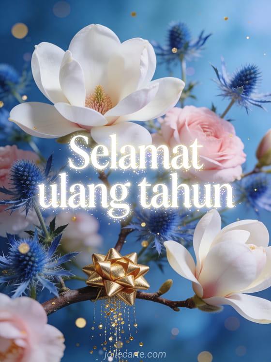 Rayakan ulang tahun dengan kartu elegan ini menampilkan magnolia putih dan merah muda dengan thistle biru, kilau emas berjatuhan dari langit, dan pita hadiah emas tergantung di cabang magnolia. Temukan juga kartu ulang tahun untuk pria atau kartu ulang tahun elegan.