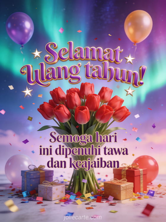 Rayakan ulang tahun penuh keajaiban dengan kartu fantasi yang memesona ini menampilkan tulip merah cerah dikelilingi konfeti warna-warni, hadiah, balon, dan aurora borealis berwarna-warni menari di langit. Temukan juga kartu ulang tahun untuk anak atau kartu ulang tahun untuk anak perempuan.