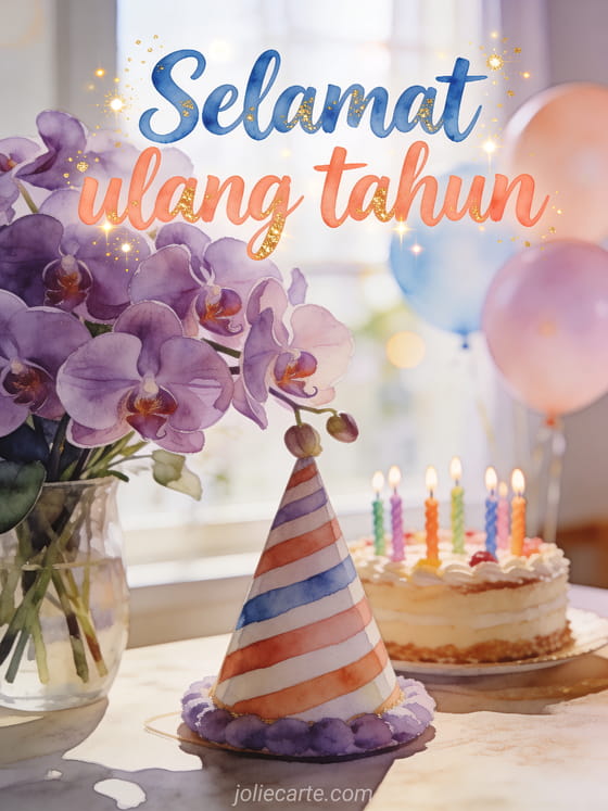 Rayakan ulang tahun dengan kartu fotorealistis yang indah ini menampilkan buket anggrek ungu yang megah dengan topi pesta bergaris, kue hias dengan lilin warna-warni, dan balon pastel dalam cahaya alami yang lembut. Temukan juga kartu ulang tahun untuk anak perempuan atau kartu ulang tahun untuk anak.