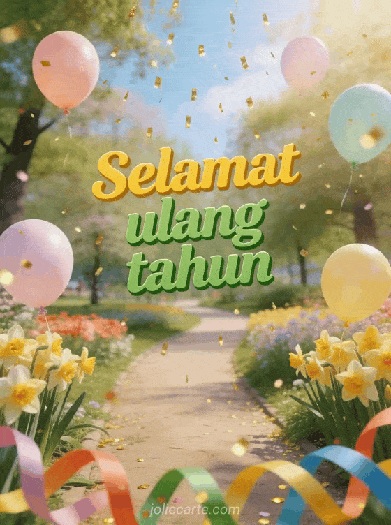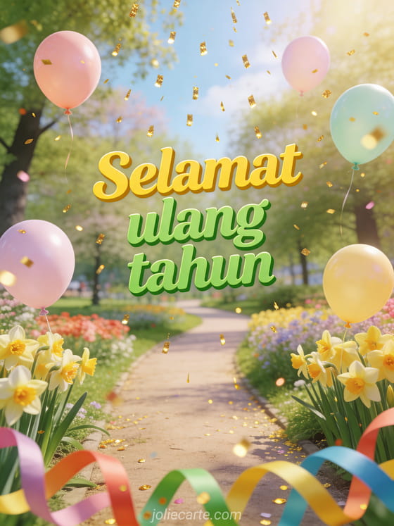 Rayakan ulang tahun dengan kartu musim semi yang ceria ini menampilkan taman dengan bunga daffodil bermekaran, balon pastel melayang di udara, dan kilau emas berjatuhan dari langit. Temukan juga kartu ulang tahun untuk anak.