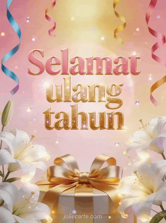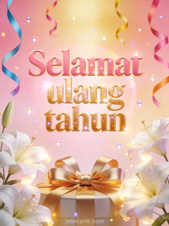 Rayakan ulang tahun istimewa dengan kartu menawan ini menampilkan bunga lili putih bercahaya dikelilingi serpentin warna-warni dan pita hadiah emas di atas latar merah muda dan emas berkilau.