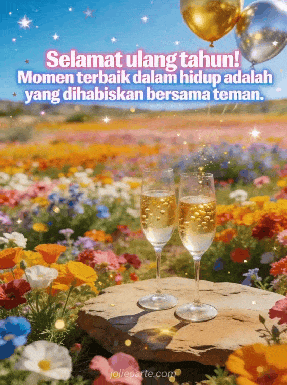 Kirim kartu ulang tahun persahabatan yang semarak dengan superbloom bunga liar, gelas sampanye di atas batu datar, balon emas dan perak melayang, dan bintang pesta berkilau. Temukan juga kartu ulang tahun untuk teman atau kartu ulang tahun dengan balon udara.