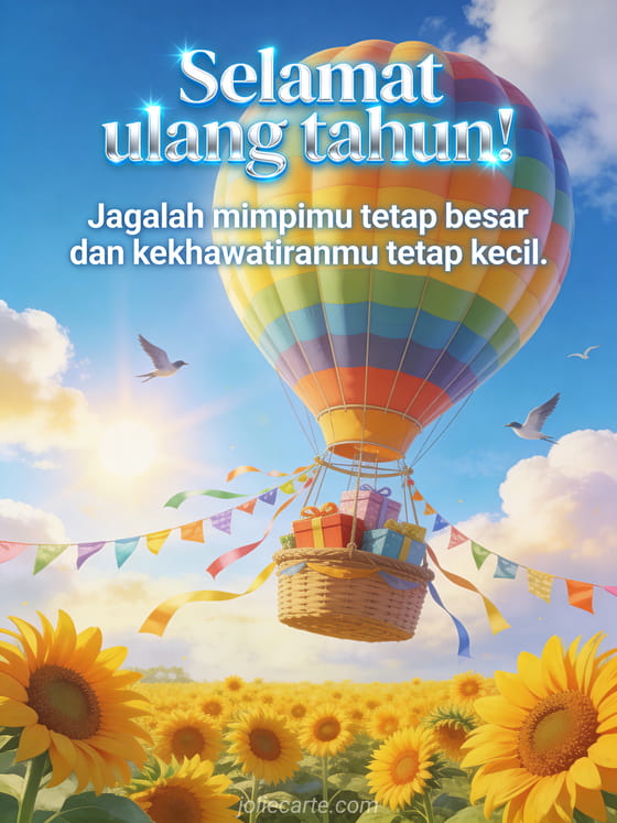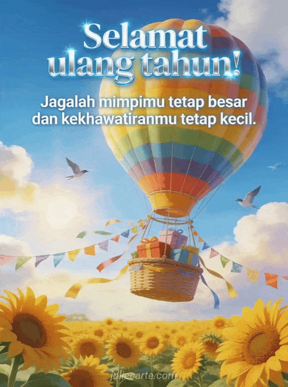 Kirim kartu ulang tahun persahabatan yang ceria dengan balon udara berwarna-warni terbang di atas ladang bunga matahari keemasan di bawah langit biru dengan burung terbang dan hadiah di keranjang. Temukan juga kartu ulang tahun lucu untuk teman atau pesan ulang tahun untuk teman.