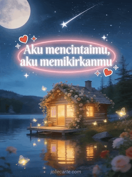 Ungkapkan cintamu dengan kartu indah ini yang menampilkan pondok menawan di tepi danau dikelilingi hati. Pesan lembut untuk memberitahu seseorang yang istimewa bahwa kamu memikirkannya. Temukan juga kartu cinta aku memikirkanmu atau kartu aku mencintaimu.