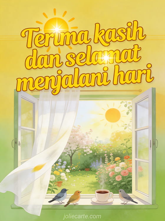 Bilang terima kasih dan doakan hari yang indah dengan kartu optimis ini yang menampilkan taman musim semi dengan kopi dan bunga. Ilustrasi pagi yang hangat untuk mencerahkan hari. Temukan juga kartu terima kasih atau kartu terima kasih untuk kalian berdua.