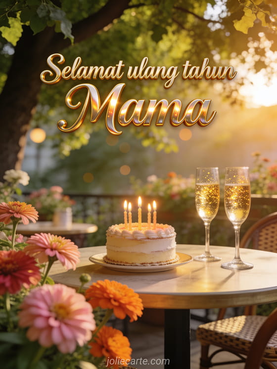 Kirim kartu ulang tahun yang penuh kasih untuk Mama dengan kue ulang tahun elegan dan sampanye berkilau di teras kafe berbunga di bawah pohon linden saat matahari terbit keemasan. Temukan juga pesan ulang tahun untuk Mama atau teks ucapan ulang tahun menyentuh untuk Mama.
