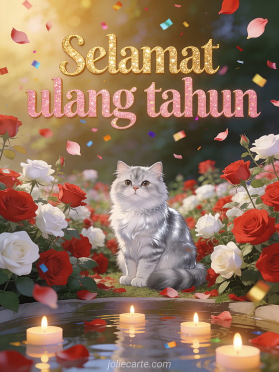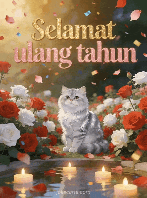 Kirim kartu animasi ulang tahun yang memukau dengan kucing Persia chinchilla perak yang elegan di antara mawar bermekaran dengan lilin melayang dan confetti emas. Temukan juga kartu ulang tahun animasi atau kartu ulang tahun animasi untuk anak laki-laki.