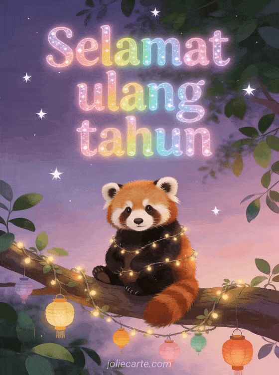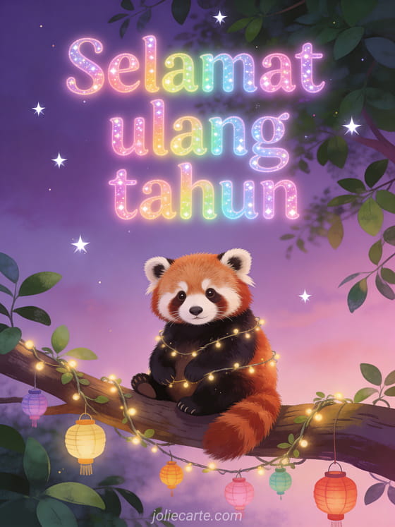 Kirim kartu ulang tahun yang memesona dengan panda merah yang menggemaskan duduk di dahan yang dihias lampu dan lampion berwarna-warni, dikelilingi dedaunan hijau dan bintang berkilau saat senja. Temukan juga kartu selamat ulang tahun atau kartu ucapan ulang tahun.