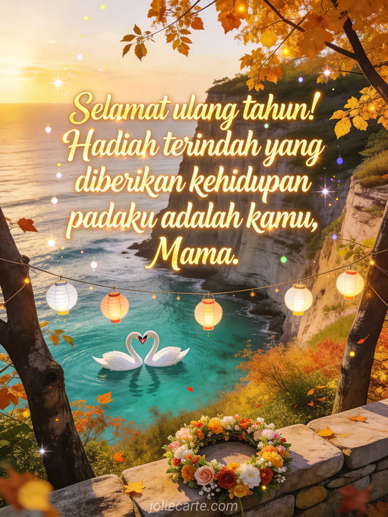 Rayakan ulang tahun mama dengan kartu gratis yang indah ini, menampilkan pemandangan pantai musim gugur yang puitis dengan angsa dan cahaya emas. Cara penuh kasih untuk mengatakan bahwa dia adalah hadiah terindah dalam hidup. Temukan juga kartu ulang tahun menyentuh untuk mama atau kartu ucapan ulang tahun untuk mama.