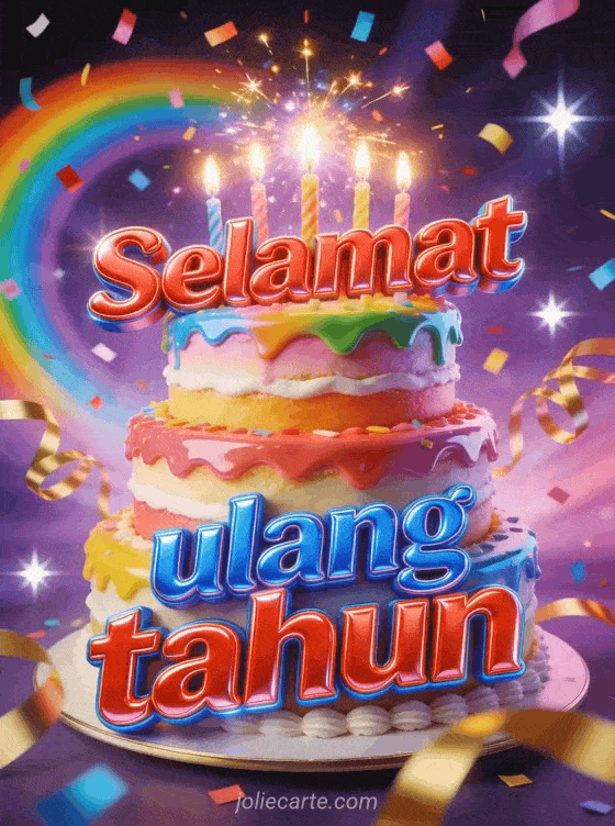 Rayakan dengan kartu ulang tahun spektakuler ini yang menampilkan kue bertingkat dengan lilin berkilau, ledakan konfeti pelangi dan pita emas berputar di latar belakang ungu berbintang. Temukan juga kartu ulang tahun dengan teks untuk remaja atau gif ulang tahun untuk remaja putri.