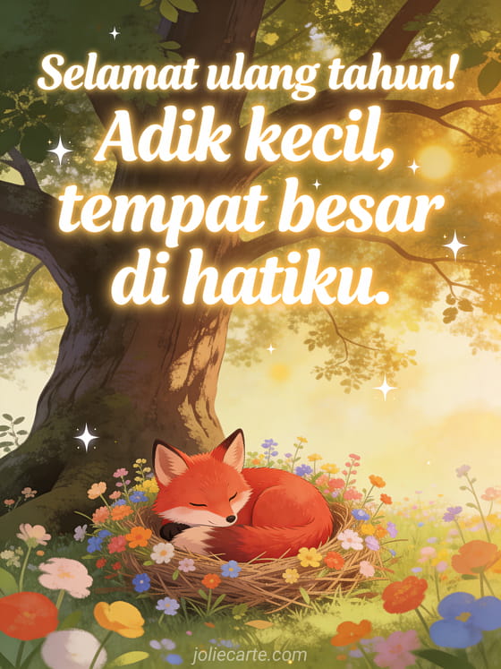 Rayakan ulang tahun adik Anda dengan kartu lembut ini menampilkan rubah merah menggemaskan bersembunyi di antara bunga liar musim semi warna-warni di bawah pohon ek besar, cahaya emas tersaring dan bintang berkedip. Temukan juga kartu gif ulang tahun kakak perempuan atau teks ulang tahun untuk saudari.