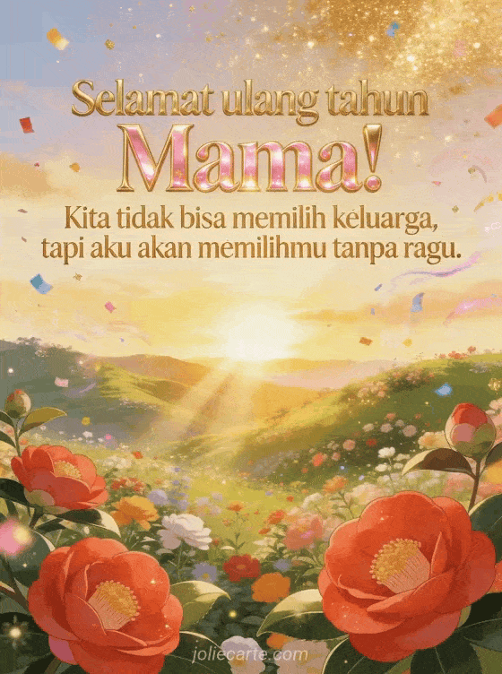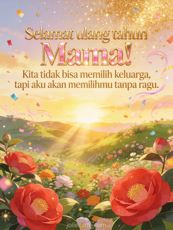 Rayakan ulang tahun Mama Anda dengan kartu bersinar ini menampilkan lembah bermekaran saat fajar emas dengan kamelia merah cerah, hujan glitter emas dan konfeti warna-warni berputar di cahaya pagi. Temukan juga kartu pesan ulang tahun Mama atau kartu ulang tahun Mama.