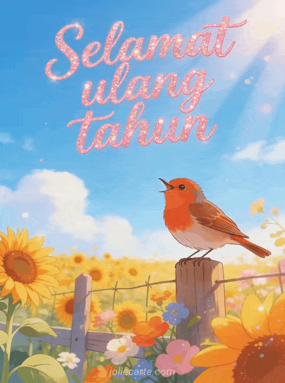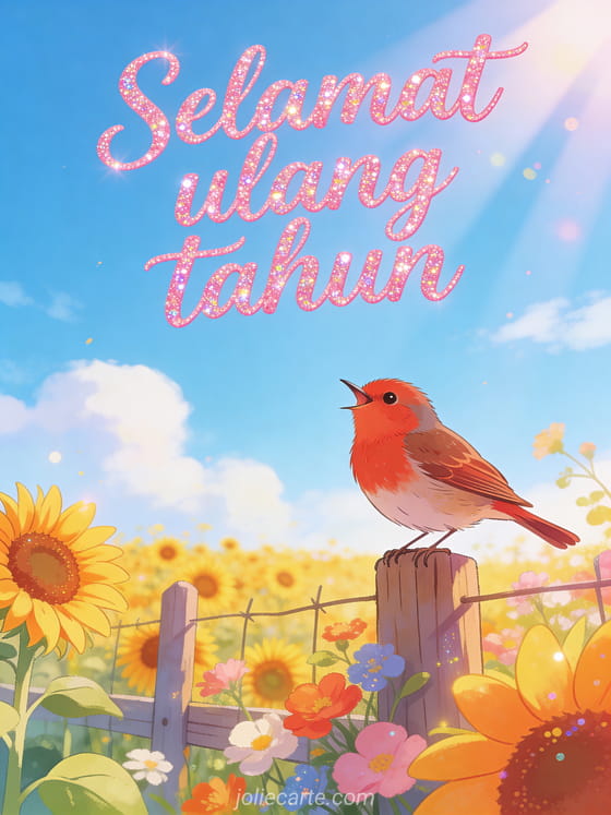 Rayakan ulang tahun dengan kartu gembira ini menampilkan ladang bunga matahari cerah di bawah langit biru musim panas, burung robin bertengger di pagar kayu bernyanyi riang dan sinar matahari hangat. Temukan juga kartu ulang tahun bunga gif atau gif musikal ulang tahun.