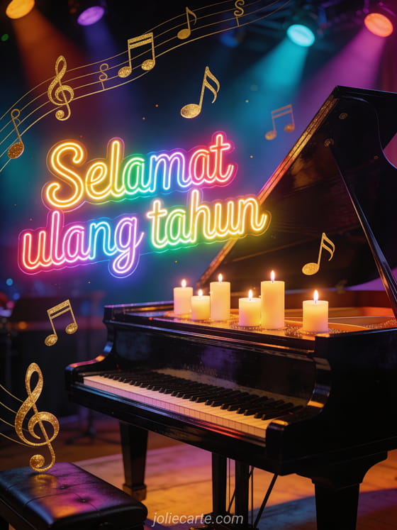 Rayakan dengan kartu ulang tahun yang meriah ini menampilkan grand piano dengan lilin, not musik emas dan kunci treble melayang di udara, lampu neon berwarna-warni dan suasana konser yang intim. Temukan juga kartu ulang tahun dengan bunga liar atau ucapan ulang tahun yang indah.