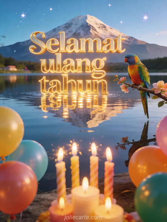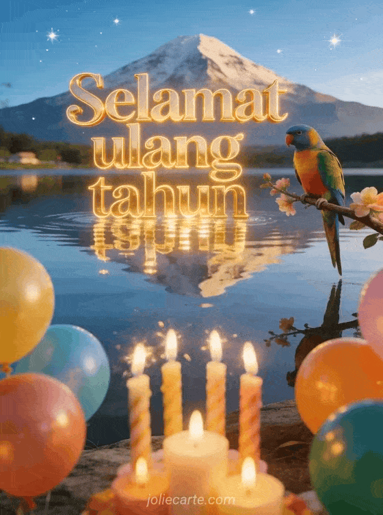 Rayakan hari istimewa dengan kartu ulang tahun animasi yang indah ini menampilkan danau cermin dengan pantulan gunung yang sempurna, burung parkit berwarna-warni di dahan berbunga dan lilin ulang tahun berkilau dengan balon berwarna-warni. Temukan juga kartu ulang tahun animasi atau kartu ulang tahun animasi musikal.