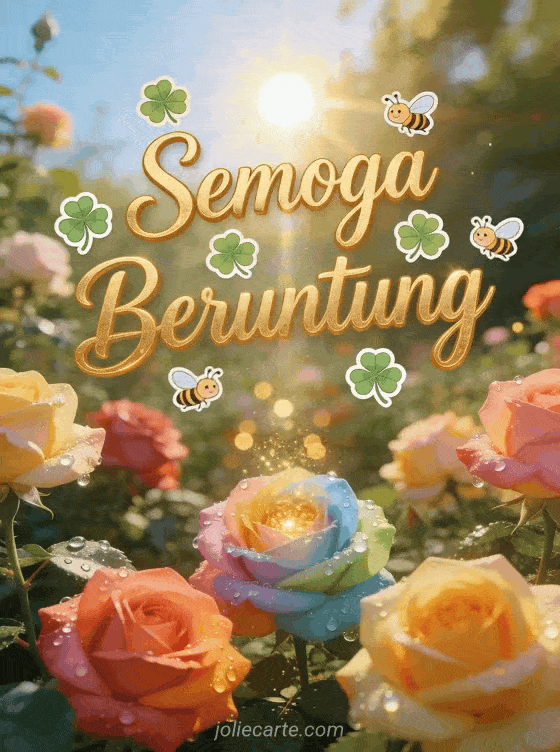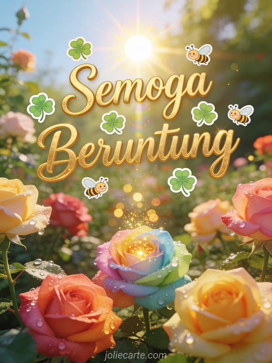 Ucapkan semoga beruntung dengan kartu ceria ini menampilkan huruf emas, semanggi berdaun empat dan lebah di taman mawar yang bermekaran di pagi hari. Temukan juga kartu semoga beruntung atau kartu ucapan semoga beruntung.