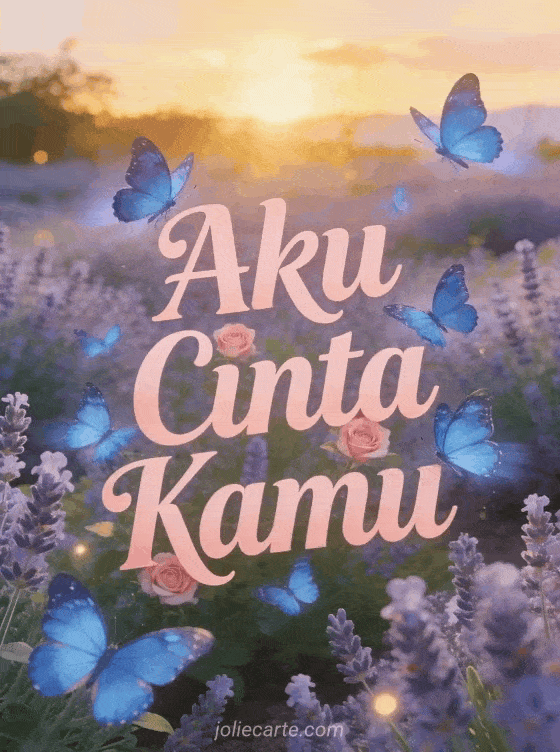 Ungkapkan perasaan cintamu dengan kartu Aku Cinta Kamu yang cantik, dihiasi kupu-kupu biru morpho di taman lavender saat matahari terbenam. Temukan juga kartu animasi cinta atau kartu emoji cinta.