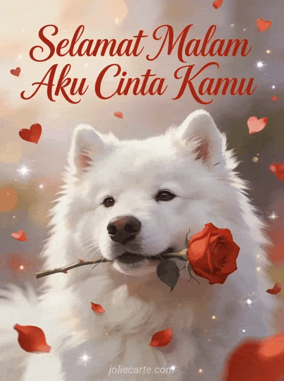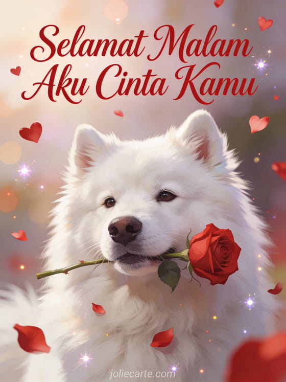 Kirim kartu selamat malam romantis ini dengan anjing Samoyed putih berbulu lebat dengan ekspresi penuh kasih yang memegang mawar merah di mulutnya dalam suasana mimpi dengan partikel cahaya berkilau. Cara manis untuk mengucapkan selamat malam kepada kekasihmu. Temukan juga kartu animasi selamat malam untuk pasangan atau kartu selamat malam romantis.