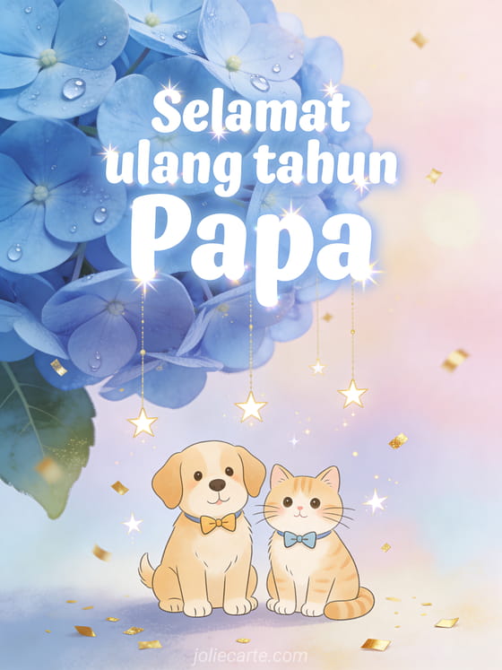 Rayakan ulang tahun papa dengan kartu gratis yang menggemaskan ini, menampilkan hydrangea biru dengan tetesan embun, anjing dan kucing berdampingan dengan dasi kupu-kupu, konfeti emas dan bintang meriah berkilau. Ucapan yang hangat dan lembut. Temukan juga kartu ulang tahun untuk papa atau kartu selamat ulang tahun untuk papa.