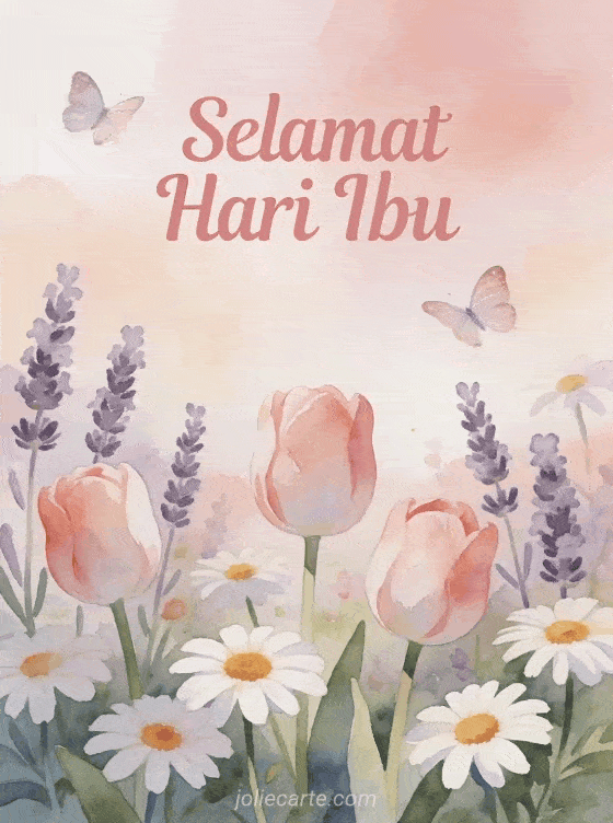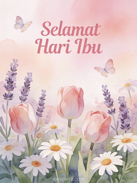 Rayakan Hari Ibu dengan kartu ucapan gratis yang menawan ini. Ilustrasi cat air yang lembut menampilkan taman musim semi yang bermekaran dengan tulip, lavender dan daisy yang bermandikan cahaya hangat, dengan kupu-kupu yang menari di antara bunga-bunga. Temukan juga kartu untuk Hari Ibu, kartu dengan gambar untuk Hari Ibu atau kartu dengan gambar untuk ibu.