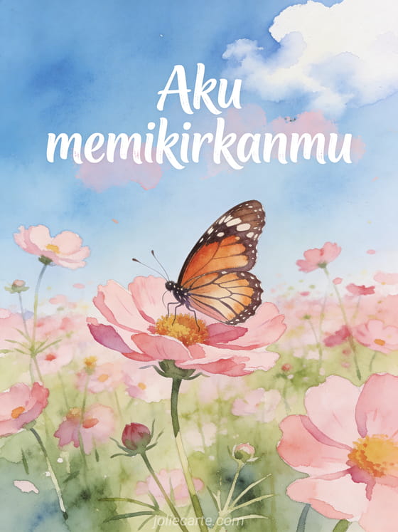 Beri tahu seseorang yang istimewa bahwa kamu memikirkannya dengan kartu cat air yang lembut ini menampilkan kupu-kupu monarki yang hinggap di bunga cosmos merah muda di padang musim panas. Pesan ringan dan puitis untuk dibagikan. Temukan juga kartu aku sangat memikirkanmu atau kartu aku memikirkanmu gif animasi.