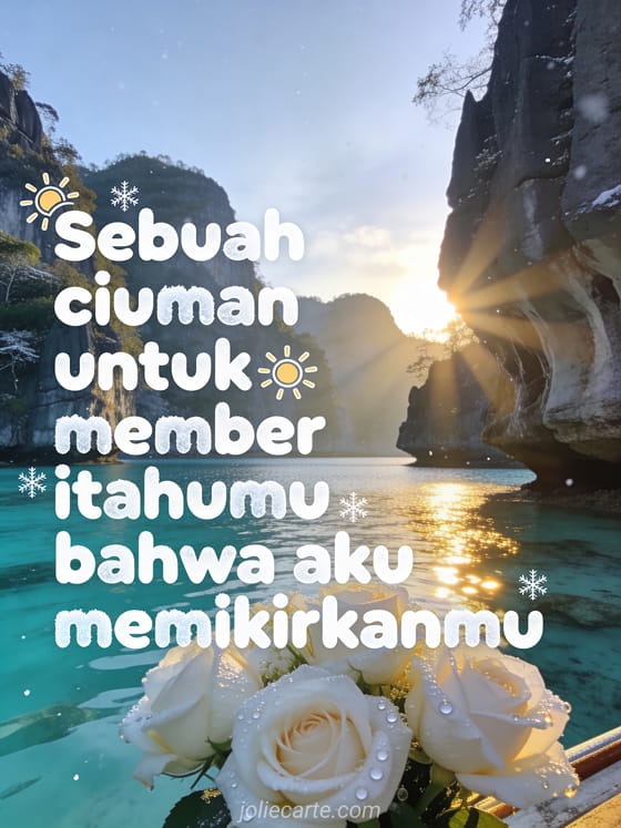 Kirimkan ciuman manis dengan kartu indah ini untuk memberitahu seseorang yang istimewa bahwa kamu memikirkannya. Ilustrasi musim dingin yang hangat dengan sinar matahari lembut untuk mencerahkan harinya. Temukan juga kartu aku mencintaimu aku memikirkanmu atau kartu cinta aku memikirkanmu.