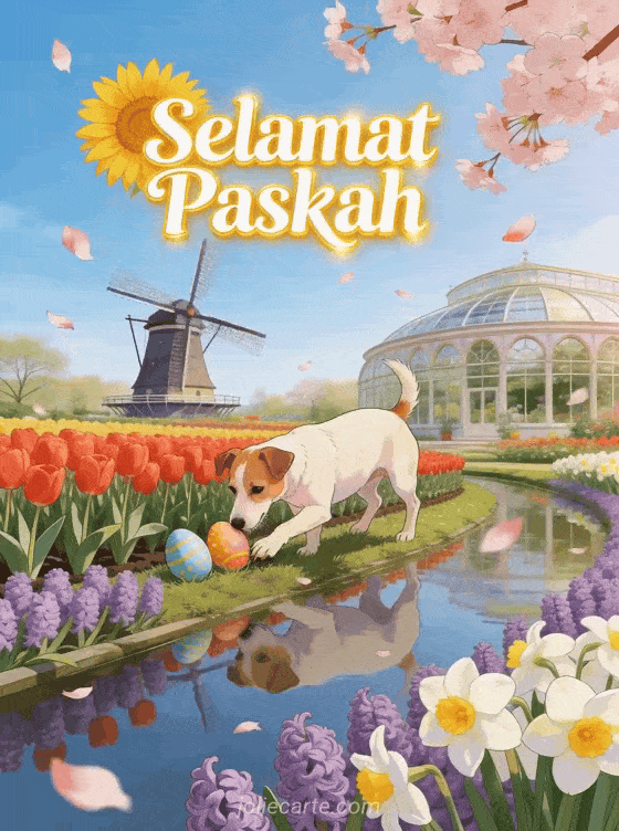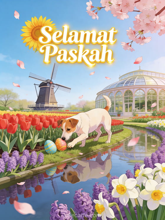 Rayakan Paskah dengan kartu ucapan animasi gratis menawan ini yang menampilkan seekor Jack Russell Terrier mencium telur Paskah di antara tulip merah di Keukenhof dengan kincir angin Belanda tercermin di kanal, bunga hyacinth, dan bunga sakura. Temukan juga message de paques à envoyer image pour paques gratuites.