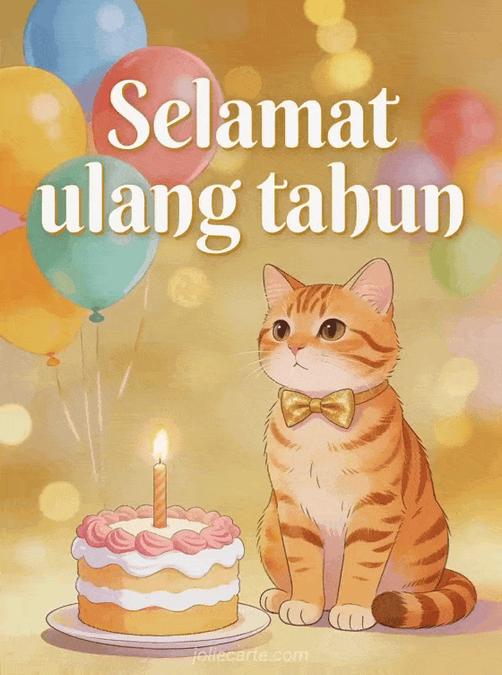 Rayakan ulang tahun dengan kartu menawan ini yang menampilkan kucing oren menggemaskan berdasi kupu-kupu emas di samping kue dengan lilin menyala, balon warna-warni dan bokeh emas hangat. Temukan juga kartu ulang tahun dengan kembang api atau kartu ulang tahun dengan huruf emas.